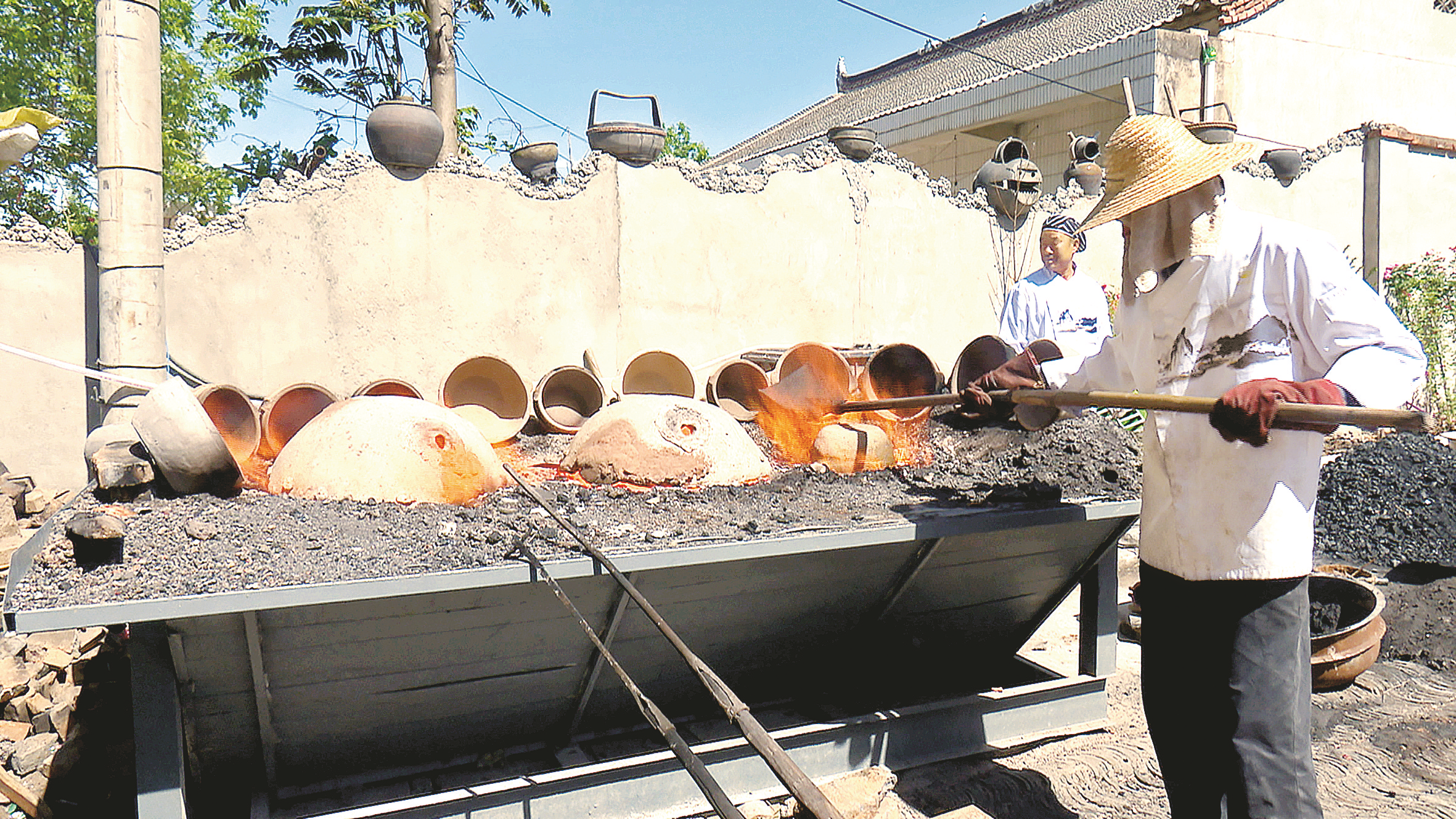 八里砂鍋傳人尤鐵娃對制作好的砂鍋進(jìn)行燒制