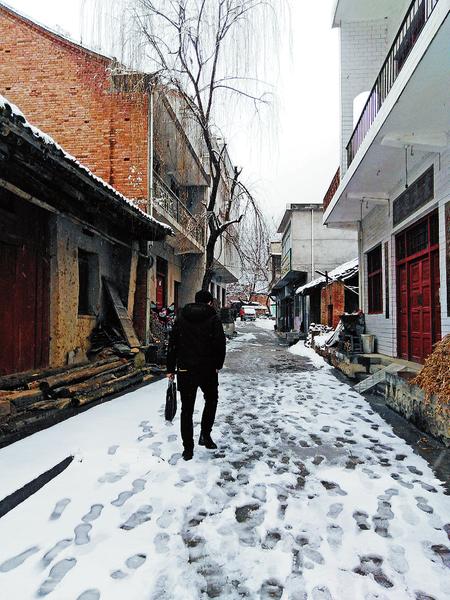 1月5日,我們?nèi)チ鲙X槽村采訪,從312國(guó)道邊的夜村鎮(zhèn)口前村找到入口,順著兩水寺溝往里走,河面漸漸變窄,兩邊的山也挨得越來(lái)越近。讓我們驚喜的是,進(jìn)了溝,我們和一場(chǎng)大雪不期而遇,一路被冬天的雪景深深吸引。而更讓我們感動(dòng)的,是包村扶貧干部冒著大雪入戶訪貧的身影。
