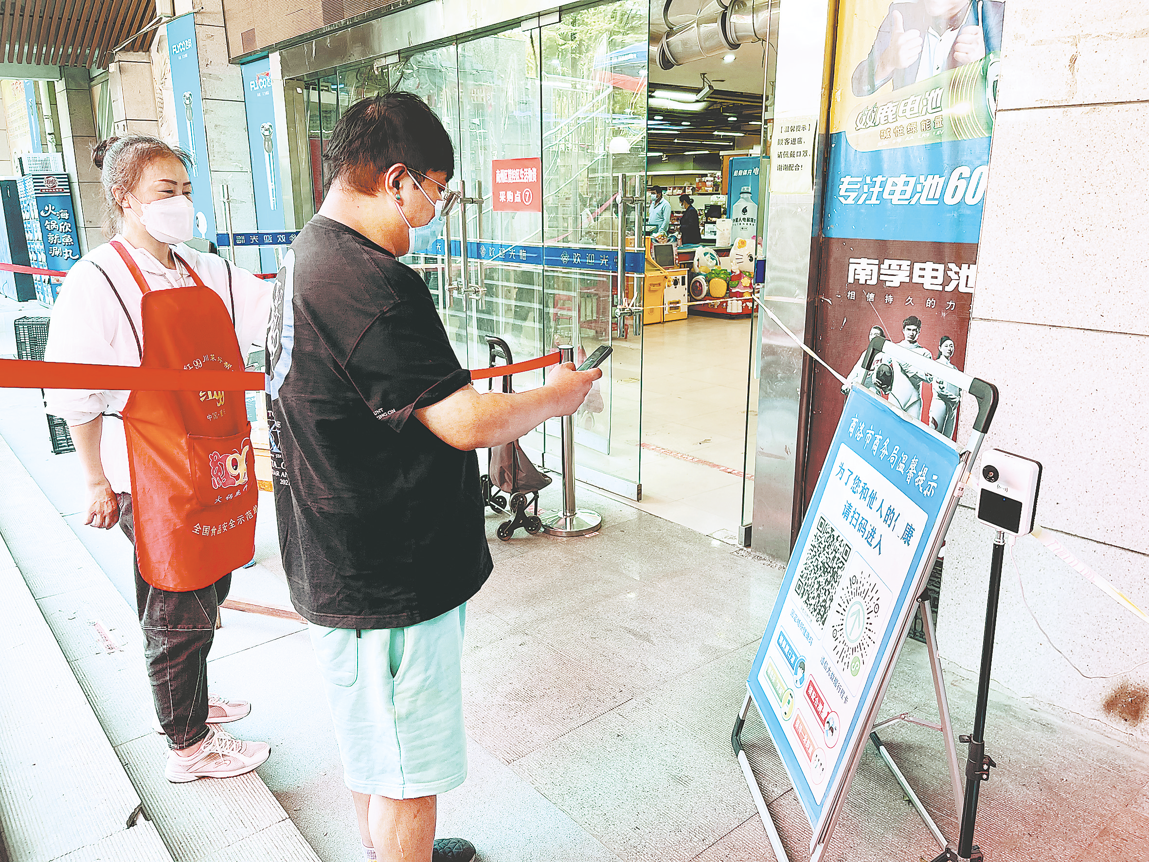 隨著商州區(qū)有序恢復(fù)生產(chǎn)生活秩序,城區(qū)各個(gè)超市逐步開(kāi)放。9月5日,記者在黃沙橋家都超市門口看到,進(jìn)入超市的市民佩戴口罩,保持安全距離,在工作人員的指導(dǎo)下測(cè)體溫、掃健康碼、酒精消毒后才能進(jìn)店。在超市內(nèi)部,工作人員對(duì)購(gòu)物車、購(gòu)物籃、收銀臺(tái)等每小時(shí)消毒一次,保持購(gòu)物環(huán)境的整潔衛(wèi)生。