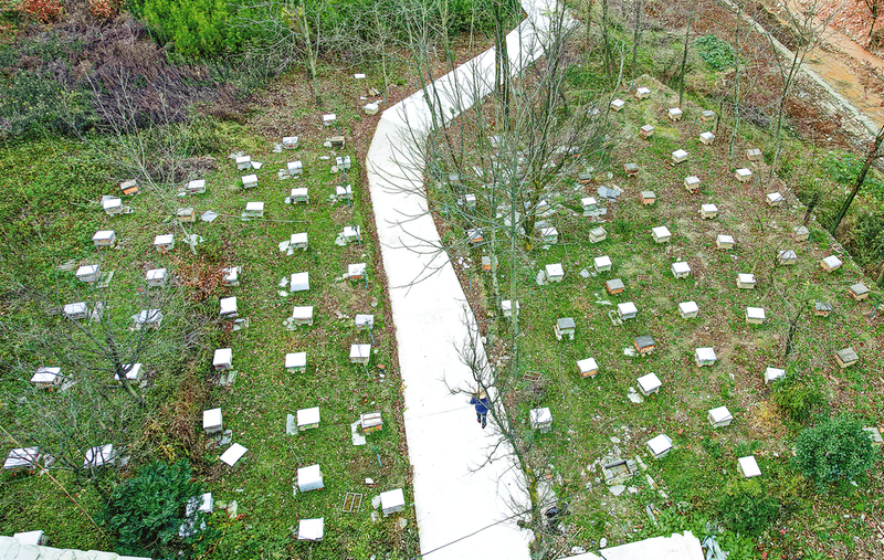 初冬,養(yǎng)蜂人家門前整齊排列的蜂箱成了村子一道獨(dú)特的風(fēng)景線。