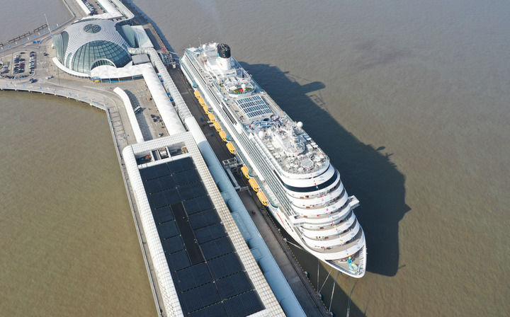 2024年1月1日,“愛達(dá)·魔都號(hào)”??吭谏虾卿量趪?guó)際郵輪港(無人機(jī)照片)。新華社記者 丁汀 攝