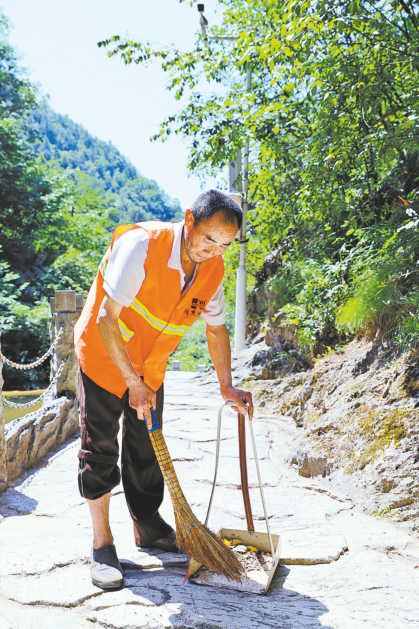 商州區(qū)江山景區(qū)清潔工陳書民在清掃景區(qū)道路