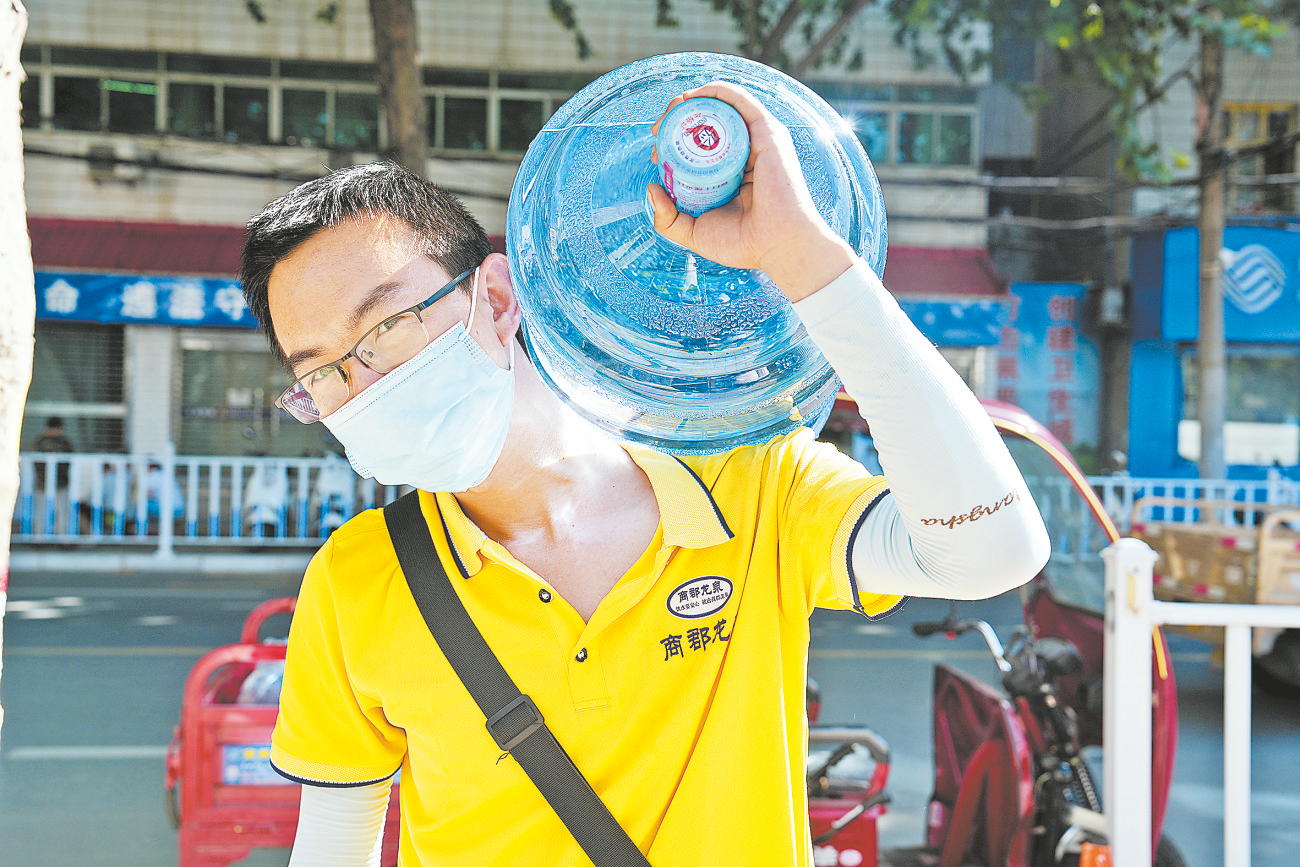 送水工王鵬飛扛著水桶上樓又下樓運(yùn)送“甘露”,汗水濕透了他的每一寸衣裳。