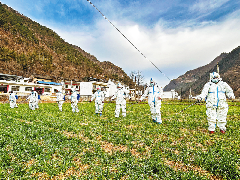 眼下正是小麥春季田間管理的關(guān)鍵時期,我市各地搶抓農(nóng)時節(jié)令,積極開展管護工作,為夏糧豐產(chǎn)豐收打下基礎。圖為2月20日,山陽縣農(nóng)技人員在色河鋪鎮(zhèn)屈家澗村,采用人工噴灑和植保無人機噴灑相結(jié)合的方式,對集中成片的麥田開展統(tǒng)防統(tǒng)治。 (本報記者 肖 云 攝)