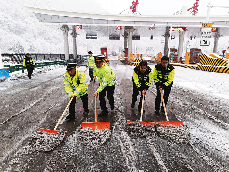 營盤收費站外路政執(zhí)法人員除雪保暢