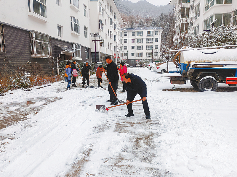 商州區(qū)三岔河鎮(zhèn)三岔河社區(qū)積極開展道路積雪清掃,干群齊上陣為群眾出行清掃出一條暖心路。 (本報記者 米子揚 攝)