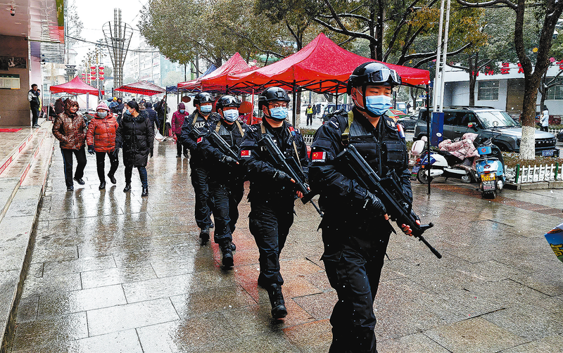 春節(jié)前后,公安商州分局在市區(qū)重點部位和人員密集場所安排武裝巡邏。圖為2月7日民警在商州商城維護秩序。