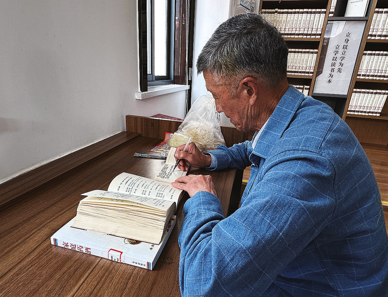活到老,學(xué)到老。在市圖書館借閱區(qū),一名老人正在寫讀后感。