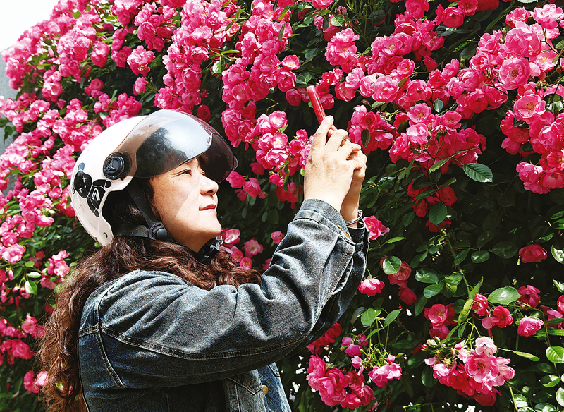 嬌艷欲滴的月季吸引行人駐足欣賞