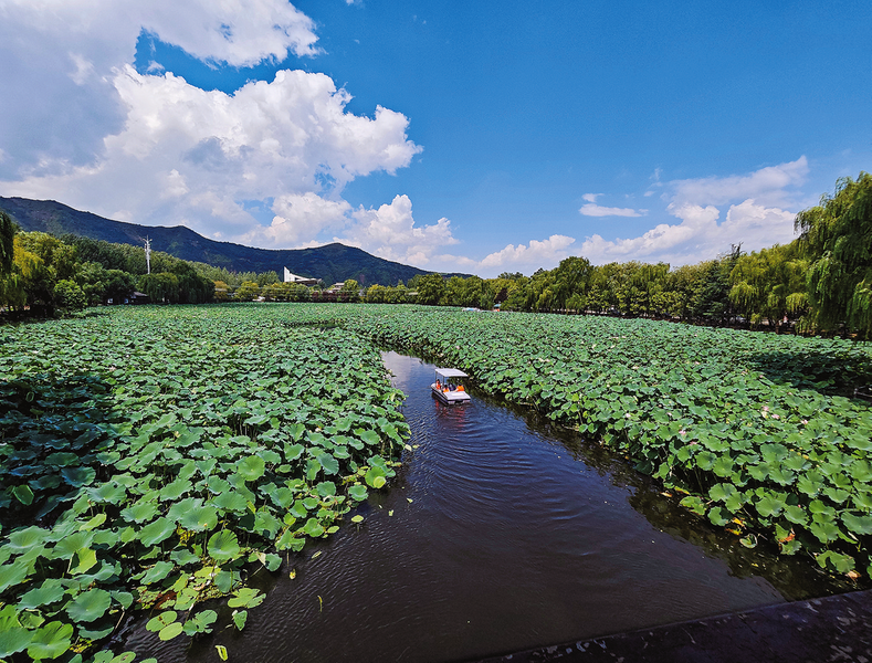 8月20日,在丹鳳縣棣花古鎮(zhèn),游客在千畝荷塘間劃船。