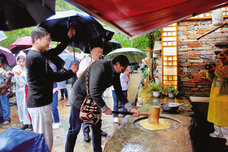 拉美詩人在村民的指導(dǎo)下,使用木錘制作糍粑。