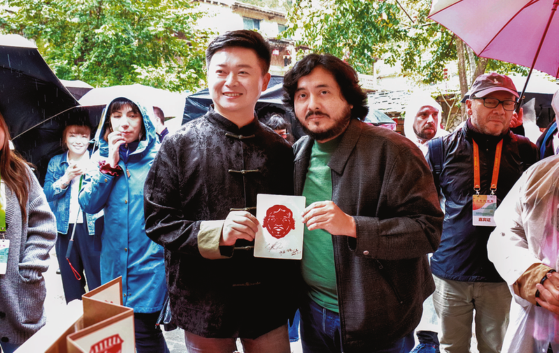 循著歌聲徐徐前行,不遠(yuǎn)處的洛南剪紙攤前,各式各樣的臉譜鋪滿桌面,紅紙在藝人石晶的指尖翻飛,剪刀開合間,一個人物臉譜便躍然紙上。巴拿馬詩人哈維爾·阿爾瓦拉多端坐攤位前,面帶微笑,滿懷期待地盯著藝人的雙手,不一會兒,哈維爾·阿爾瓦拉的面容在紅紙上逐漸顯現(xiàn)。