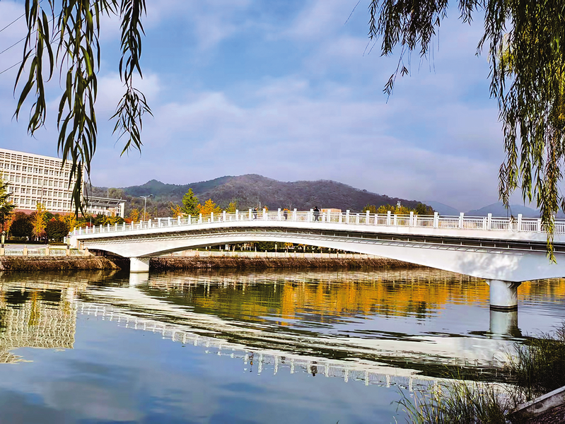 △在市區(qū)丹江公園,碧藍而高遠的天空、白色的橋和金色的銀杏葉倒映在清澈的河水中,如同一幅秋日油畫。 ?市區(qū)濱江銀杏公園內(nèi),市民在高大的銀杏樹間散步,盡顯秋日的愜意。