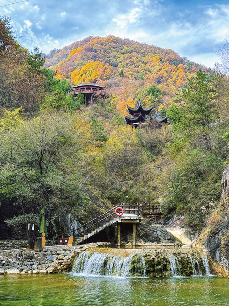 ?在秦嶺江山景區(qū),飛檐翹角的亭子掩映在碧水、藍天和斑斕的山色中,共同構(gòu)成了一幅秋日盛景。