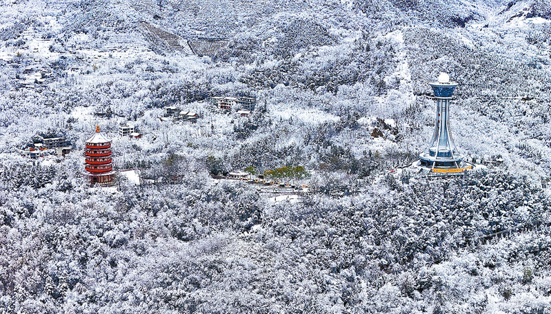 如絮似羽的冬雪將金鳳山染成銀白,盡顯巍峨素雅。