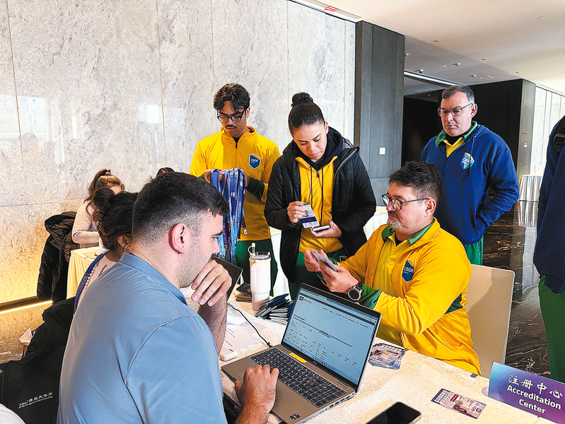 12月3日,U15世界中學(xué)生排球錦標(biāo)賽報(bào)到現(xiàn)場(chǎng),來(lái)自全球18個(gè)國(guó)家及地區(qū)的參賽隊(duì)伍陸續(xù)抵達(dá)報(bào)到處,現(xiàn)場(chǎng)秩序井然、活力滿滿。圖為巴西隊(duì)隊(duì)員正在工作人員指引下,有序辦理報(bào)到手續(xù)、領(lǐng)取參賽證件。(本報(bào)記者 謝 非 攝)