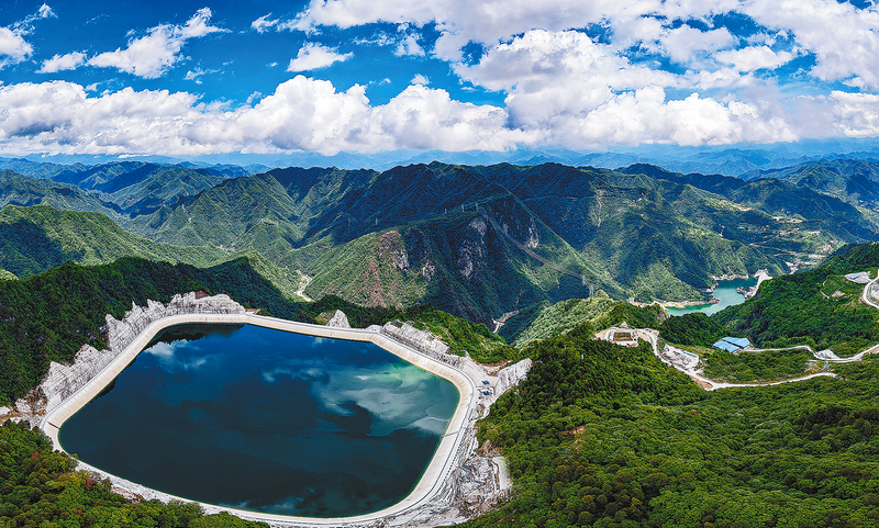 近日,在國(guó)網(wǎng)新源陜西鎮(zhèn)安抽水蓄能電站,通過(guò)無(wú)人機(jī)從高空俯瞰,藍(lán)天白云倒映下的上水庫(kù),在蔥郁的青山間十分壯觀,一幅“高峽出平湖、綠水繞青山”的畫(huà)卷徐徐展開(kāi)。