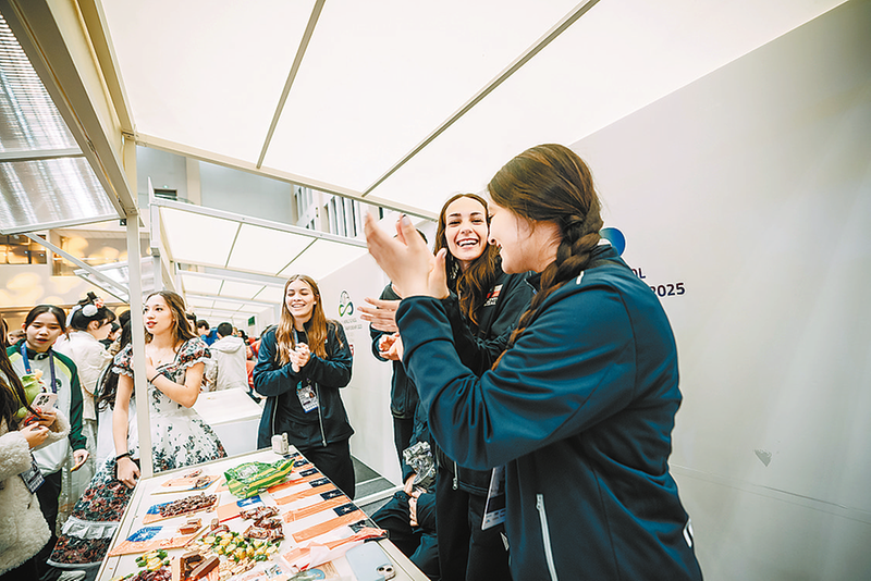 ?、?2月9日,在“國家之夜”現(xiàn)場的文化展示區(qū)域,有的參賽隊(duì)伍帶來了巧克力、咖啡等特色產(chǎn)品,吸引了眾多參賽隊(duì)員駐足品嘗。