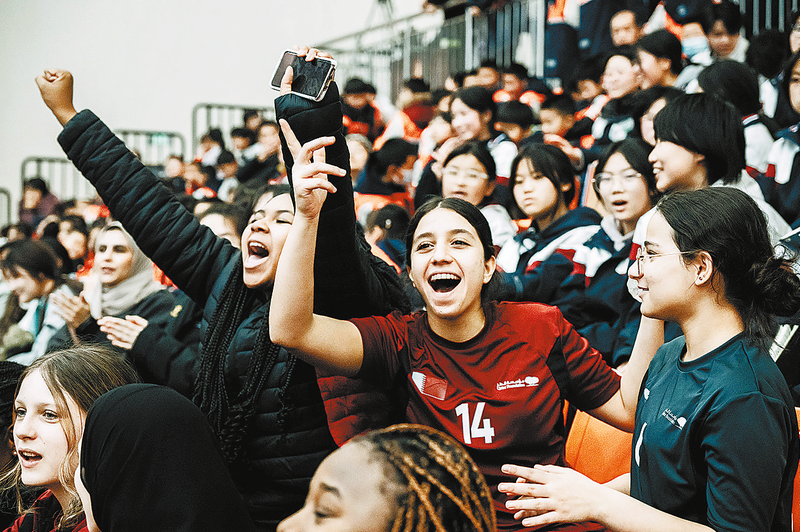 ?、?2月11日,看臺(tái)上,觀賽隊(duì)伍為場上球員的出色表現(xiàn)吶喊喝彩。