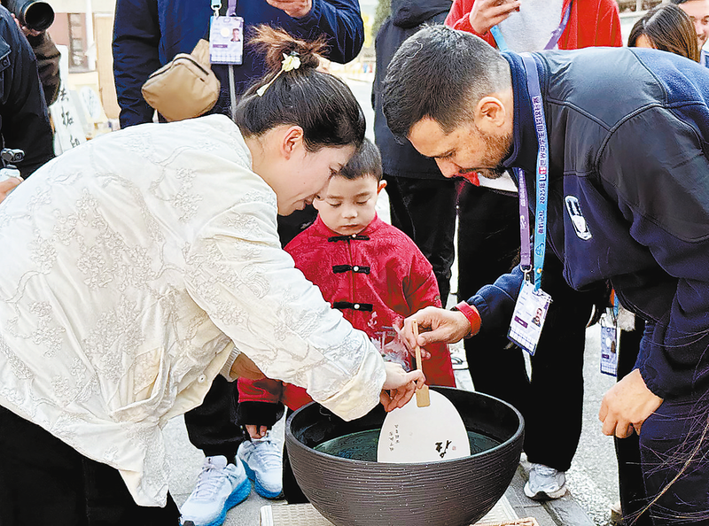 ?、?2月9日,文化交流日當(dāng)天,各國運(yùn)動(dòng)員走進(jìn)我市六所學(xué)校感受中國文化和體育發(fā)展的蓬勃活力。圖為球員在商州區(qū)六小感受中國書法和書畫的魅力。