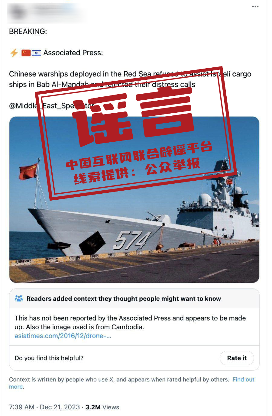 真相:針對(duì)“一艘以色列商船向中國(guó)海軍烏魯木齊艦進(jìn)行求助遭到拒絕”的報(bào)道,國(guó)防部新聞發(fā)言人吳謙在12月28日的例行記者會(huì)上回應(yīng),這是徹頭徹尾的假消息。另?yè)?jù)新華社25日?qǐng)?bào)道,一個(gè)有十多萬(wàn)“粉絲”的境外社交平臺(tái)賬號(hào)以美聯(lián)社為“信源”發(fā)帖稱,“中國(guó)軍艦在曼德海峽拒絕協(xié)助以色列貨船,且無(wú)視他們的呼救。”這一謠言隨即被多個(gè)權(quán)威信源辟謠。事實(shí)上,美聯(lián)社根本沒(méi)有這則報(bào)道。(來(lái)源:中華人民共和國(guó)國(guó)防部、新華社)