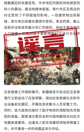 真相:近日,有網(wǎng)民發(fā)布帖文稱“新疆喀什市7月22日發(fā)生6.3級地震,周邊村莊建筑出現(xiàn)裂痕,部分老舊房屋在震感中受損……”。經(jīng)新疆喀什市應(yīng)急管理局證實(shí),當(dāng)日喀什市域內(nèi)未發(fā)生地震,中國地震臺網(wǎng)也未發(fā)布喀什當(dāng)日發(fā)生地震的相關(guān)信息,此信息為虛假內(nèi)容。(來源:網(wǎng)信新疆、新疆喀什網(wǎng)絡(luò)舉報)