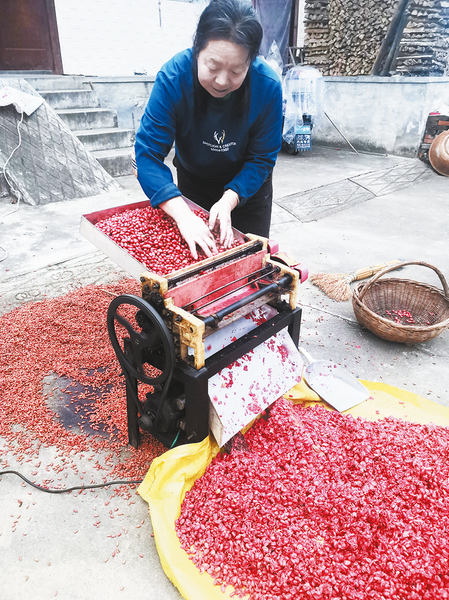 丹鳳縣惠南種植專業(yè)合作社工作人員說:“今年山茱萸豐收了,顆大肉厚、色澤鮮亮,我們從10月初就多方籌資30萬元開始收購山茱萸。投資7000多元購買了4臺山茱萸去核機(jī),合作社每天收購加工鮮山茱萸果5噸多,然后將山茱萸粗加工后發(fā)往安徽亳州中藥材市場。”