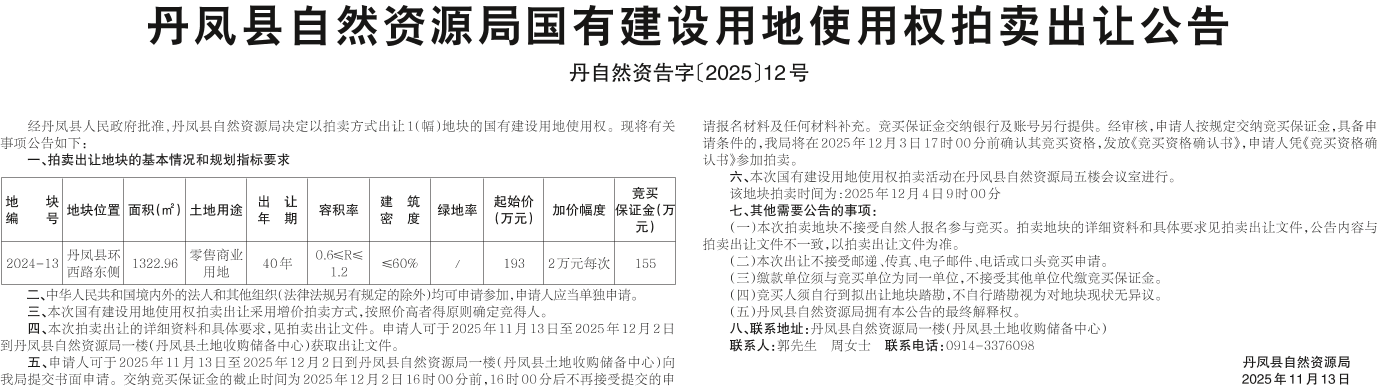 丹鳳縣自然資源局國(guó)有建設(shè)用地使用權(quán)拍賣(mài)出讓公告