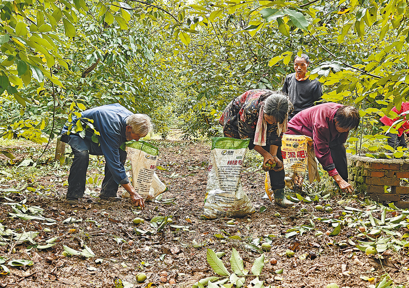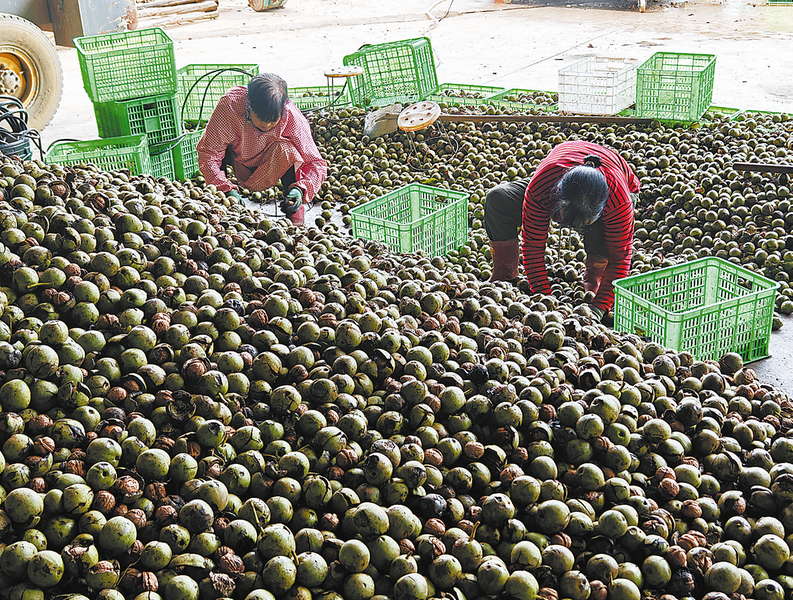 △剛剛從樹上打下來的鮮核桃,村民及時(shí)撿拾,收集后運(yùn)送至廠區(qū)。