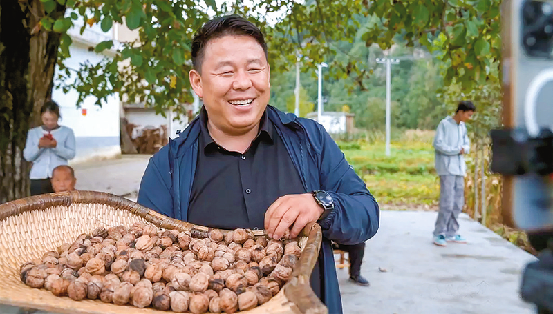 薛超正在對著手機直播,將村民的核桃、木耳等農(nóng)產(chǎn)品通過網(wǎng)絡(luò)平臺銷售出去。