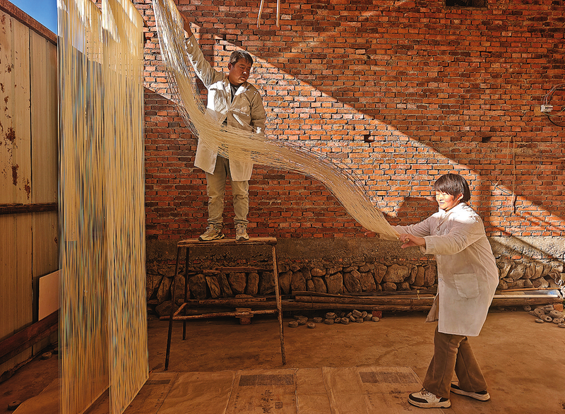 11月28日清晨,郭軍盈和張益憑借彼此之間的默契和手語溝通,在小院里麻利地晾曬掛面。