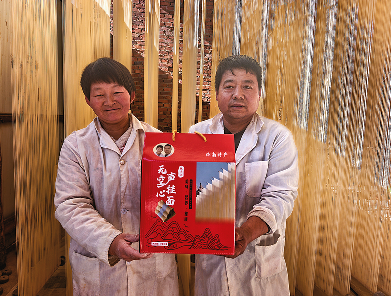 張益和郭軍盈緊跟時代發(fā)展,制作包裝盒,把自己的掛面起名為“無聲空心掛面”。
