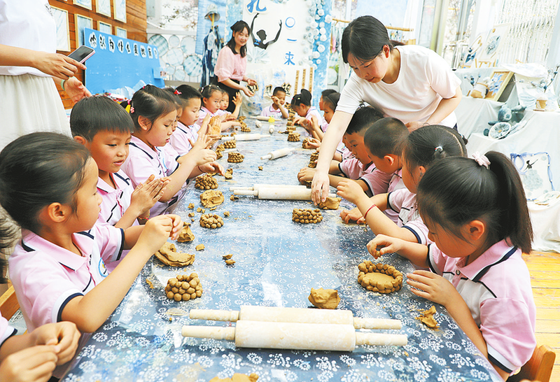 ?“非遺進(jìn)校園”活動中,文化志愿者為雅都幼兒園小朋友現(xiàn)場教授商南泥塑制作技藝。(商南縣文化館供圖)