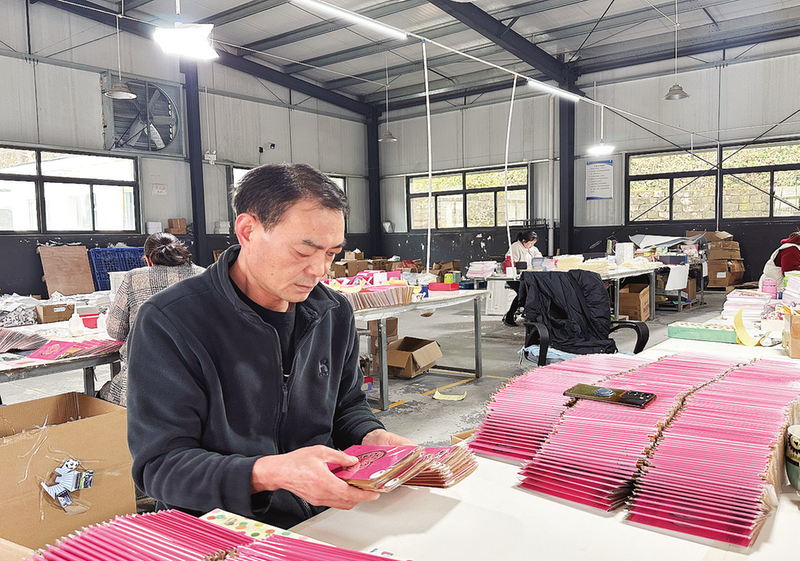 ?青山鎮(zhèn)社區(qū)工廠帶動(dòng)100多人穩(wěn)定就業(yè)。圖為工人李陸林整理賀卡。