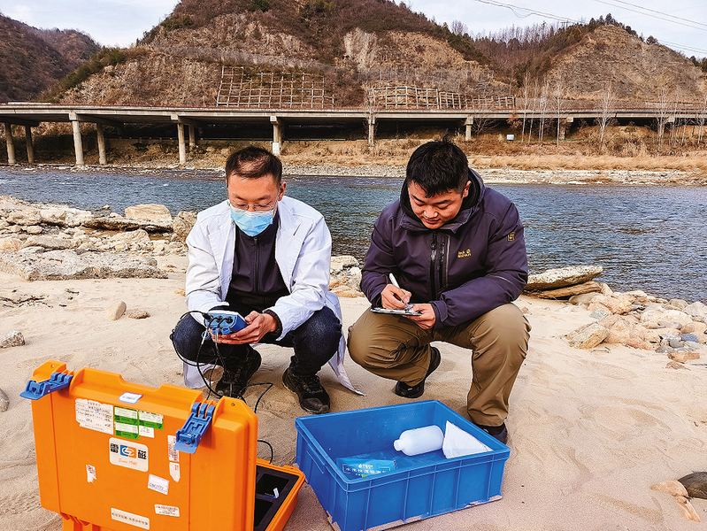 12月8日,在過風(fēng)樓鎮(zhèn)丹江河畔,市生態(tài)環(huán)境局商南縣分局監(jiān)測(cè)站的工作人員在采集水樣,現(xiàn)場(chǎng)初步檢測(cè)分析該水域環(huán)境狀況。